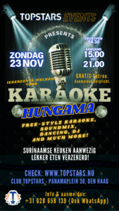 Topstars Events presents: KARAOKE HUNGAMA! Zondag 23 november bij Club Topstars in Den Haag! Deur open: 14.30u Start: 15.00u tot